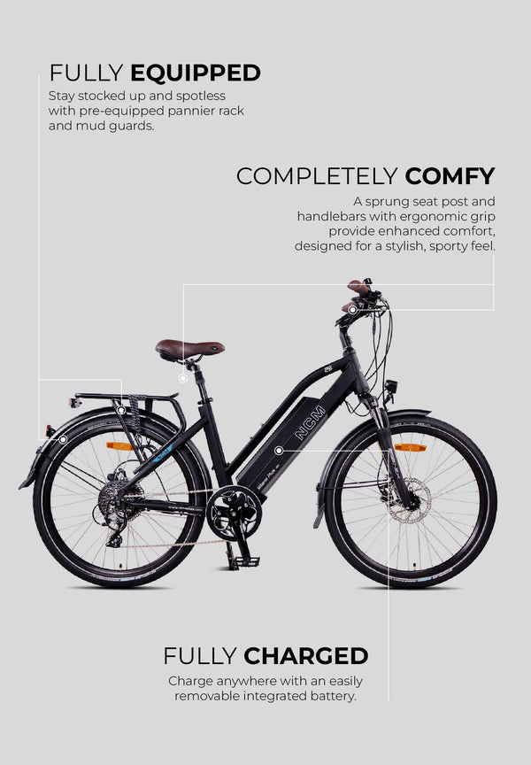 Balancing accessibility with superior specifications, the NCM Milano Plus is a step-through e-trekking bike for riders that are eager to tackle longer routes alongside their daily rides and want an e-bike with the range and the integrity to help them do it.